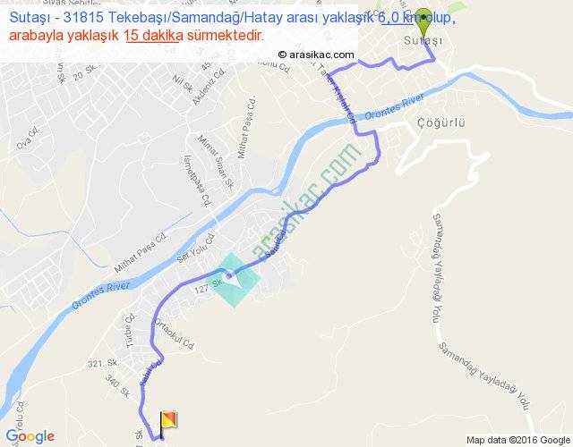 Sutaşı - 31815 Tekebaşı Samandağ Hatay arası yaklaşık olarak 90 km/h ile yukarıda belirtilen sürede olup, iki yerin kuş uçuşu uzaklığı (mesafesi) 4'dir. Yolculuk otobüsle 19 dakika sürmektedir.