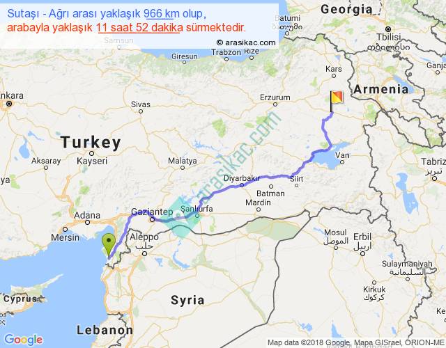 Sutaşı - Ağrı arası yaklaşık olarak 90 km/h ile yukarıda belirtilen sürede olup, iki yerin kuş uçuşu uzaklığı (mesafesi) 734'dir. Eğer belirtilen yerler arasında uçak seferi var ise bu süre uçakla 1 saat 07 dakika'ya kadar düşebilir. Yolculuk otobüsle 15 saat 25 dakika sürmektedir.