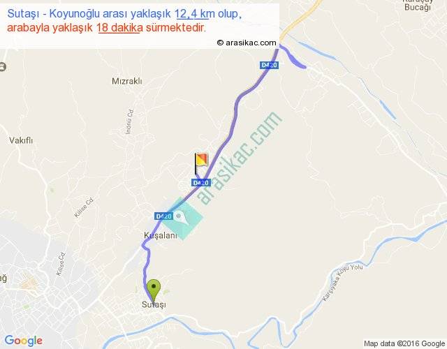 Sutaşı - Koyunoğlu arası yaklaşık olarak 90 km/h ile yukarıda belirtilen sürede olup, iki yerin kuş uçuşu uzaklığı (mesafesi) 3'dir. Yolculuk otobüsle 23 dakika sürmektedir.