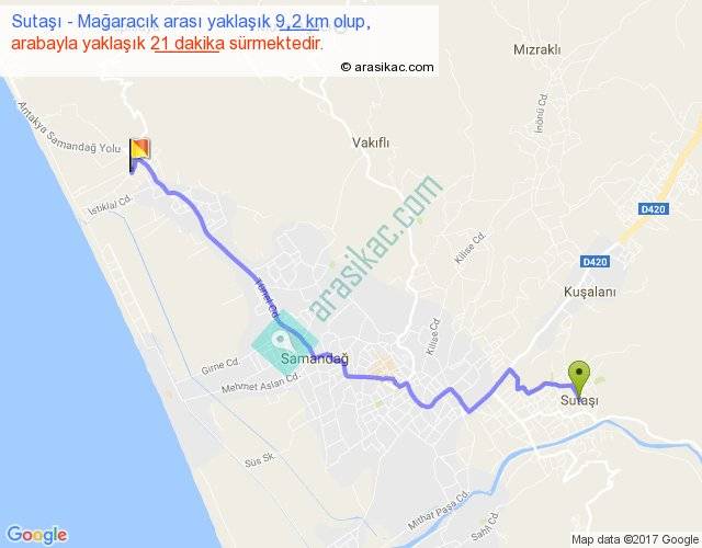 Sutaşı - Mağaracık arası yaklaşık olarak 90 km/h ile yukarıda belirtilen sürede olup, iki yerin kuş uçuşu uzaklığı (mesafesi) 7'dir. Yolculuk otobüsle 27 dakika sürmektedir.