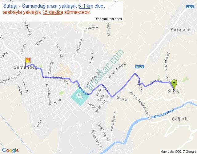 Sutaşı - Samandağ arası yaklaşık olarak 90 km/h ile yukarıda belirtilen sürede olup, iki yerin kuş uçuşu uzaklığı (mesafesi) 4'dir. Yolculuk otobüsle 19 dakika sürmektedir.