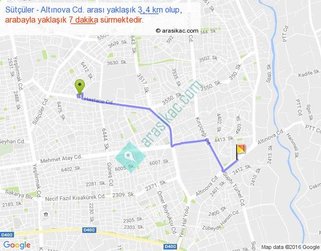 Sütçüler - Altınova Cd. arası yaklaşık olarak 90 km/h ile yukarıda belirtilen sürede olup, iki yerin kuş uçuşu uzaklığı (mesafesi) 3'dir. Yolculuk otobüsle 9 dakika sürmektedir.