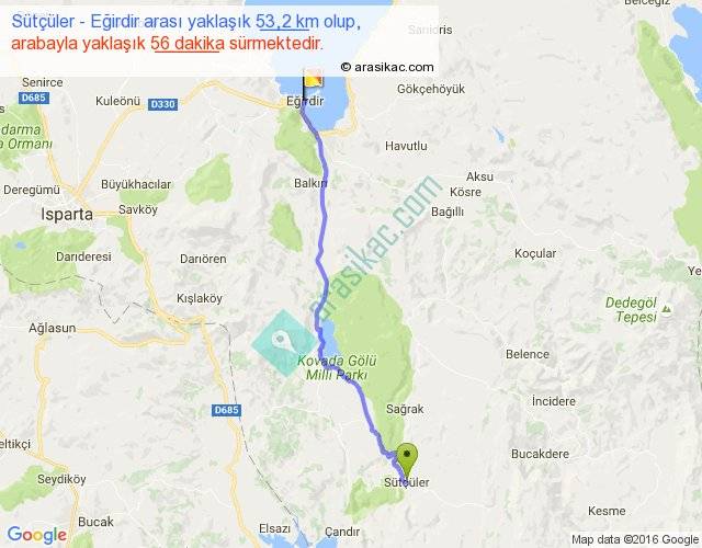Sütçüler - Eğirdir arası yaklaşık olarak 90 km/h ile yukarıda belirtilen sürede olup, iki yerin kuş uçuşu uzaklığı (mesafesi) 43'dir. Yolculuk otobüsle 1 saat 12 dakika sürmektedir.