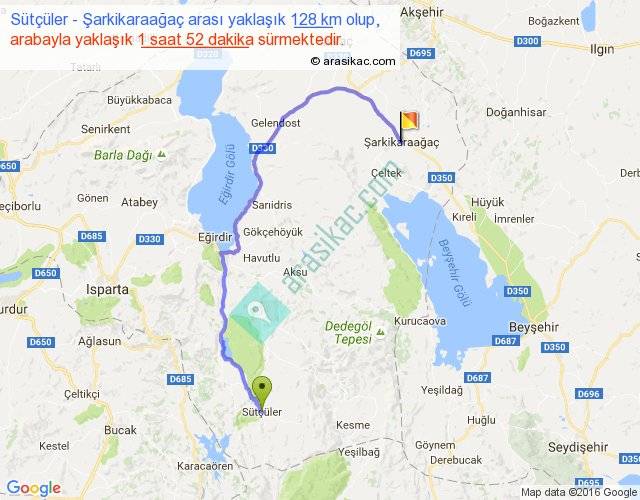 Sütçüler - Şarkikaraağaç arası yaklaşık olarak 90 km/h ile yukarıda belirtilen sürede olup, iki yerin kuş uçuşu uzaklığı (mesafesi) 73'dir. Yolculuk otobüsle 2 saat 25 dakika sürmektedir.