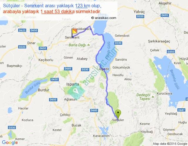 Sütçüler - Senirkent arası yaklaşık olarak 90 km/h ile yukarıda belirtilen sürede olup, iki yerin kuş uçuşu uzaklığı (mesafesi) 77'dir. Yolculuk otobüsle 2 saat 26 dakika sürmektedir.
