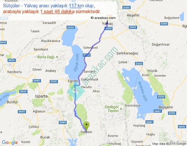 Sütçüler - Yalvaç arası yaklaşık olarak 90 km/h ile yukarıda belirtilen sürede olup, iki yerin kuş uçuşu uzaklığı (mesafesi) 91'dir. Yolculuk otobüsle 2 saat 17 dakika sürmektedir.