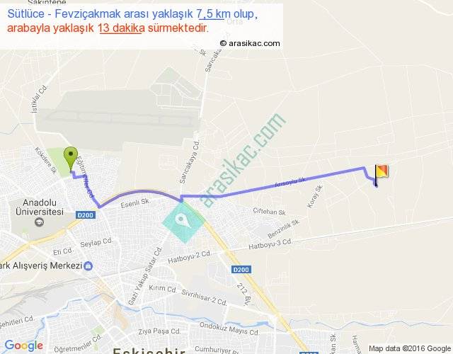 Sütlüce - Fevziçakmak arası yaklaşık olarak 90 km/h ile yukarıda belirtilen sürede olup, iki yerin kuş uçuşu uzaklığı (mesafesi) 6'dir. Yolculuk otobüsle 16 dakika sürmektedir.