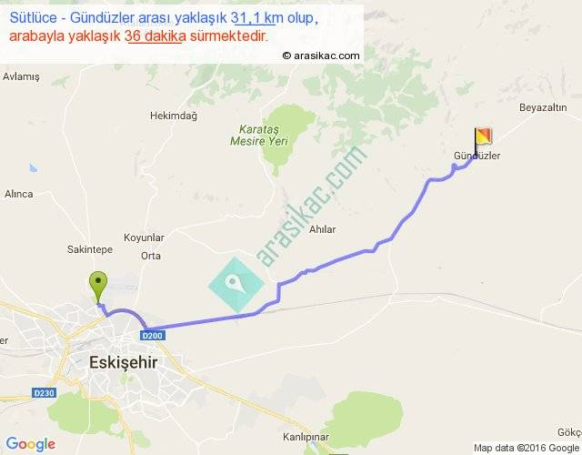 Sütlüce - Gündüzler arası yaklaşık olarak 90 km/h ile yukarıda belirtilen sürede olup, iki yerin kuş uçuşu uzaklığı (mesafesi) 26'dir. Yolculuk otobüsle 46 dakika sürmektedir.
