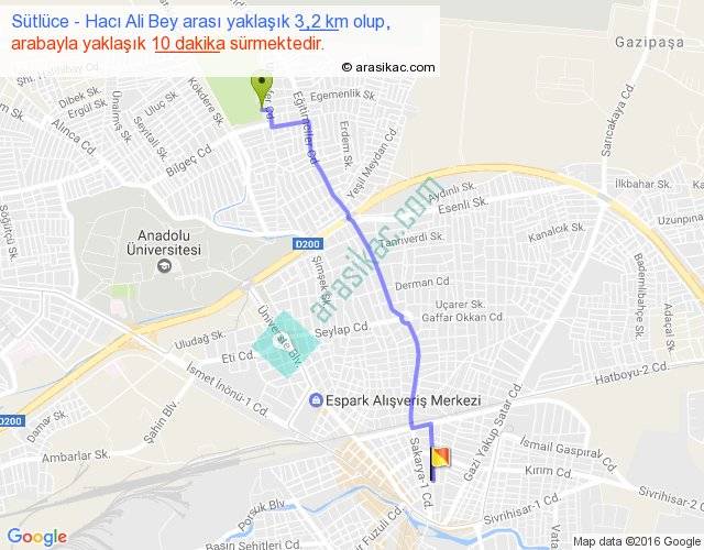 Sütlüce - Hacı Ali Bey arası yaklaşık olarak 90 km/h ile yukarıda belirtilen sürede olup, iki yerin kuş uçuşu uzaklığı (mesafesi) 3'dir. Yolculuk otobüsle 13 dakika sürmektedir.