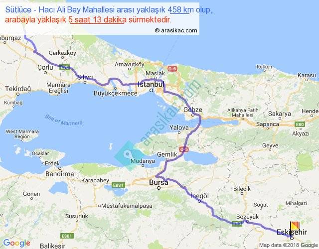 Sütlüce - Hacı Ali Bey Mahallesi arası yaklaşık olarak 90 km/h ile yukarıda belirtilen sürede olup, iki yerin kuş uçuşu uzaklığı (mesafesi) 312'dir. Eğer belirtilen yerler arasında uçak seferi var ise bu süre uçakla 28 dakika'ya kadar düşebilir. Yolculuk otobüsle 6 saat 46 dakika sürmektedir.
