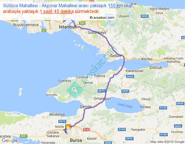 Sütlüce Mahallesi - Akpınar Mahallesi arası yaklaşık olarak 90 km/h ile yukarıda belirtilen sürede olup, iki yerin kuş uçuşu uzaklığı (mesafesi) 89'dir. Yolculuk otobüsle 2 saat 16 dakika sürmektedir.