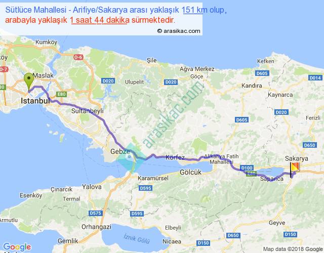 Sütlüce Mahallesi - Arifiye Sakarya arası yaklaşık olarak 90 km/h ile yukarıda belirtilen sürede olup, iki yerin kuş uçuşu uzaklığı (mesafesi) 125'dir. Yolculuk otobüsle 2 saat 15 dakika sürmektedir.