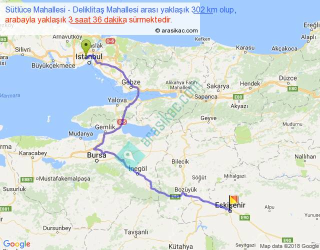 Sütlüce Mahallesi - Deliklitaş Mahallesi arası yaklaşık olarak 90 km/h ile yukarıda belirtilen sürede olup, iki yerin kuş uçuşu uzaklığı (mesafesi) 194'dir. Yolculuk otobüsle 4 saat 40 dakika sürmektedir.