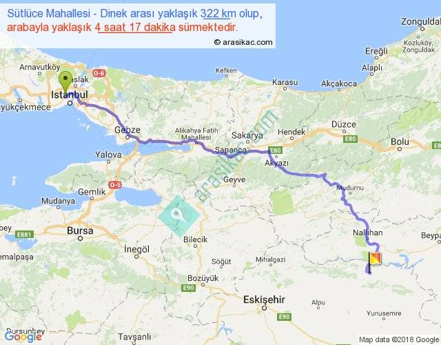 Sütlüce Mahallesi - Dinek arası yaklaşık olarak 90 km/h ile yukarıda belirtilen sürede olup, iki yerin kuş uçuşu uzaklığı (mesafesi) 236'dir. Yolculuk otobüsle 5 saat 34 dakika sürmektedir.