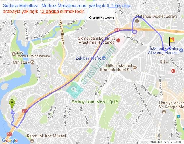 Sütlüce Mahallesi - Merkez Mahallesi arası yaklaşık olarak 90 km/h ile yukarıda belirtilen sürede olup, iki yerin kuş uçuşu uzaklığı (mesafesi) 4'dir. Yolculuk otobüsle 16 dakika sürmektedir.
