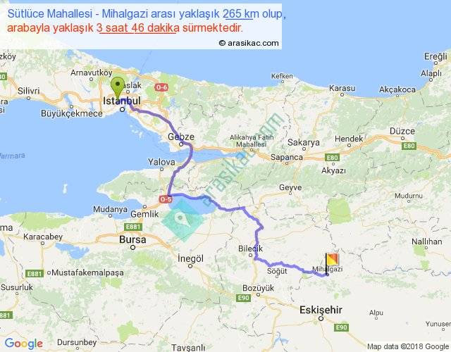 Sütlüce Mahallesi - Mihalgazi arası yaklaşık olarak 90 km/h ile yukarıda belirtilen sürede olup, iki yerin kuş uçuşu uzaklığı (mesafesi) 178'dir. Yolculuk otobüsle 4 saat 53 dakika sürmektedir.