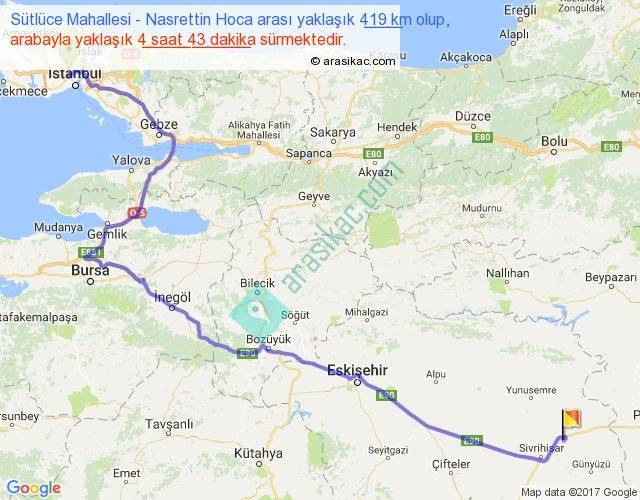 Sütlüce Mahallesi - Nasrettin Hoca arası yaklaşık olarak 90 km/h ile yukarıda belirtilen sürede olup, iki yerin kuş uçuşu uzaklığı (mesafesi) 285'dir. Eğer belirtilen yerler arasında uçak seferi var ise bu süre uçakla 26 dakika'ya kadar düşebilir. Yolculuk otobüsle 6 saat 7 dakika sürmektedir.
