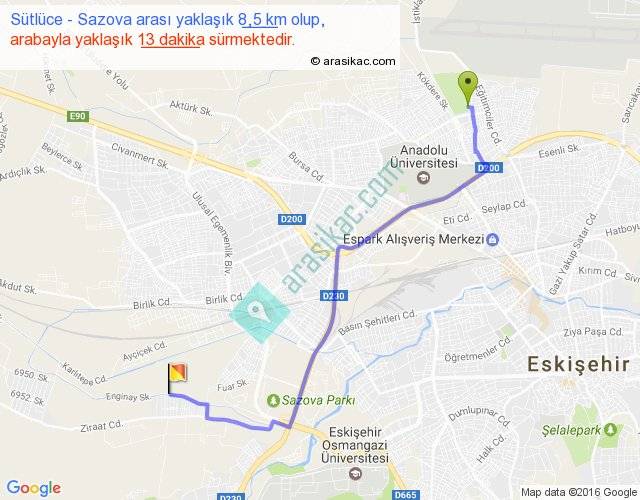 Sütlüce - Sazova arası yaklaşık olarak 90 km/h ile yukarıda belirtilen sürede olup, iki yerin kuş uçuşu uzaklığı (mesafesi) 6'dir. Yolculuk otobüsle 16 dakika sürmektedir.