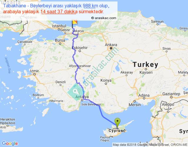Tabakhane - Beylerbeyi arası yaklaşık olarak 90 km/h ile yukarıda belirtilen sürede olup, iki yerin kuş uçuşu uzaklığı (mesafesi) 716'dir. Eğer belirtilen yerler arasında uçak seferi var ise bu süre uçakla 1 saat 06 dakika'ya kadar düşebilir. Yolculuk otobüsle 19 saat 0 dakika sürmektedir.