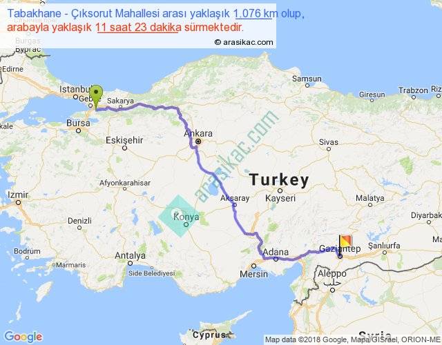 Tabakhane - Çıksorut Mahallesi arası yaklaşık olarak 90 km/h ile yukarıda belirtilen sürede olup, iki yerin kuş uçuşu uzaklığı (mesafesi) 779'dir. Eğer belirtilen yerler arasında uçak seferi var ise bu süre uçakla 1 saat 11 dakika'ya kadar düşebilir. Yolculuk otobüsle 14 saat 47 dakika sürmektedir.