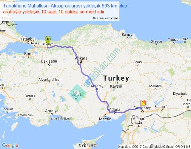 Tabakhane Mahallesi - Aktoprak arası yaklaşık olarak 90 km/h ile yukarıda belirtilen sürede olup, iki yerin kuş uçuşu uzaklığı (mesafesi) 710'dir. Eğer belirtilen yerler arasında uçak seferi var ise bu süre uçakla 1 saat 05 dakika'ya kadar düşebilir. Yolculuk otobüsle 13 saat 13 dakika sürmektedir.
