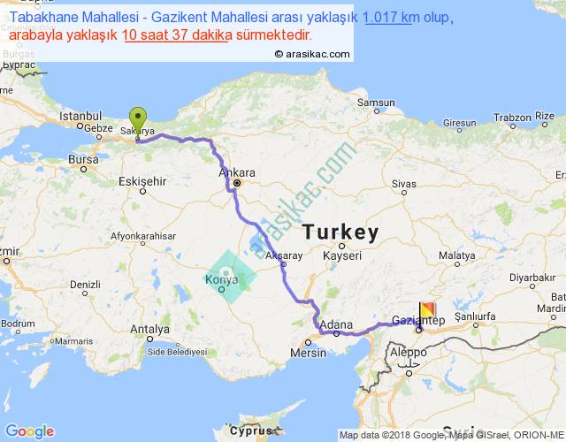 Tabakhane Mahallesi - Gazikent Mahallesi arası yaklaşık olarak 90 km/h ile yukarıda belirtilen sürede olup, iki yerin kuş uçuşu uzaklığı (mesafesi) 727'dir. Eğer belirtilen yerler arasında uçak seferi var ise bu süre uçakla 1 saat 07 dakika'ya kadar düşebilir. Yolculuk otobüsle 13 saat 48 dakika sürmektedir.