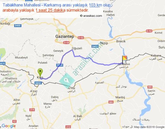 Tabakhane Mahallesi - Karkamış arası yaklaşık olarak 90 km/h ile yukarıda belirtilen sürede olup, iki yerin kuş uçuşu uzaklığı (mesafesi) 79'dir. Yolculuk otobüsle 1 saat 50 dakika sürmektedir.