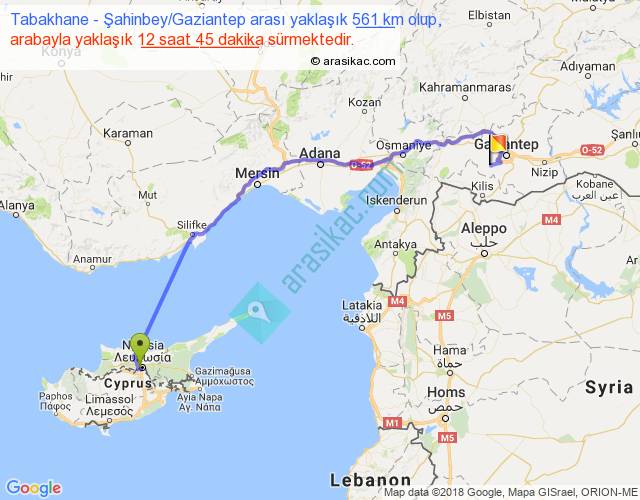 Tabakhane - Şahinbey Gaziantep arası yaklaşık olarak 90 km/h ile yukarıda belirtilen sürede olup, iki yerin kuş uçuşu uzaklığı (mesafesi) 398'dir. Eğer belirtilen yerler arasında uçak seferi var ise bu süre uçakla 36 dakika'ya kadar düşebilir. Yolculuk otobüsle 16 saat 34 dakika sürmektedir.