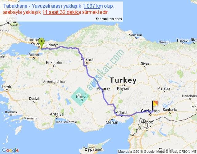 Tabakhane - Yavuzeli arası yaklaşık olarak 90 km/h ile yukarıda belirtilen sürede olup, iki yerin kuş uçuşu uzaklığı (mesafesi) 777'dir. Eğer belirtilen yerler arasında uçak seferi var ise bu süre uçakla 1 saat 11 dakika'ya kadar düşebilir. Yolculuk otobüsle 14 saat 59 dakika sürmektedir.