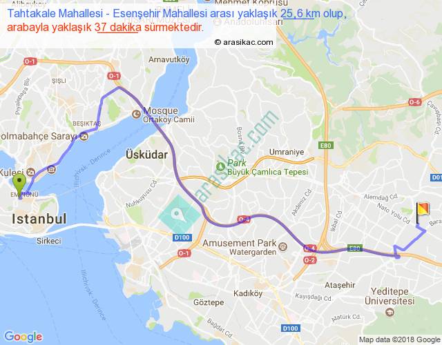 Tahtakale Mahallesi - Esenşehir Mahallesi arası yaklaşık olarak 90 km/h ile yukarıda belirtilen sürede olup, iki yerin kuş uçuşu uzaklığı (mesafesi) 17'dir. Yolculuk otobüsle 48 dakika sürmektedir.