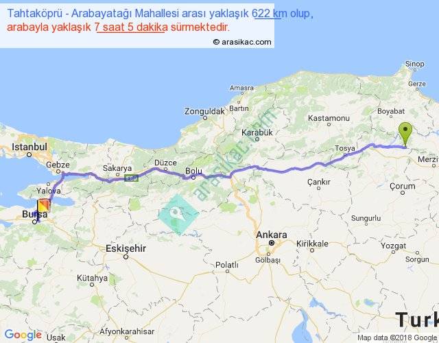 Tahtaköprü - Arabayatağı Mahallesi arası yaklaşık olarak 90 km/h ile yukarıda belirtilen sürede olup, iki yerin kuş uçuşu uzaklığı (mesafesi) 502'dir. Eğer belirtilen yerler arasında uçak seferi var ise bu süre uçakla 46 dakika'ya kadar düşebilir. Yolculuk otobüsle 9 saat 12 dakika sürmektedir.