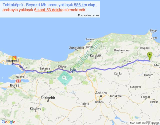 Tahtaköprü - Beyazıt Mh. arası yaklaşık olarak 90 km/h ile yukarıda belirtilen sürede olup, iki yerin kuş uçuşu uzaklığı (mesafesi) 503'dir. Eğer belirtilen yerler arasında uçak seferi var ise bu süre uçakla 46 dakika'ya kadar düşebilir. Yolculuk otobüsle 8 saat 56 dakika sürmektedir.