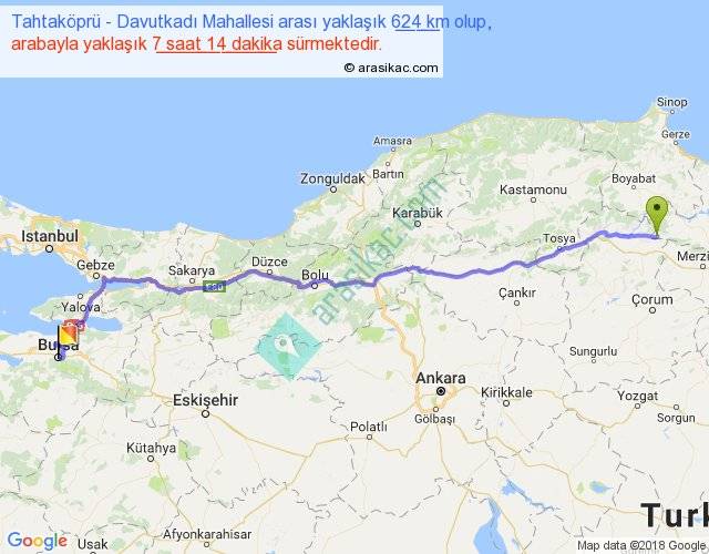 Tahtaköprü - Davutkadı Mahallesi arası yaklaşık olarak 90 km/h ile yukarıda belirtilen sürede olup, iki yerin kuş uçuşu uzaklığı (mesafesi) 507'dir. Eğer belirtilen yerler arasında uçak seferi var ise bu süre uçakla 46 dakika'ya kadar düşebilir. Yolculuk otobüsle 9 saat 24 dakika sürmektedir.