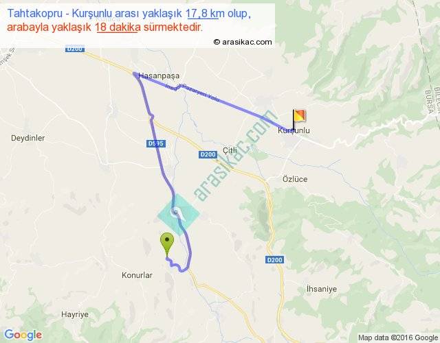 Tahtakopru - Kurşunlu arası yaklaşık olarak 90 km/h ile yukarıda belirtilen sürede olup, iki yerin kuş uçuşu uzaklığı (mesafesi) 8'dir. Yolculuk otobüsle 23 dakika sürmektedir.