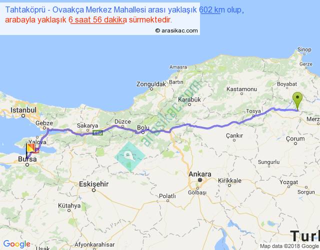 Tahtaköprü - Ovaakça Merkez Mahallesi arası yaklaşık olarak 90 km/h ile yukarıda belirtilen sürede olup, iki yerin kuş uçuşu uzaklığı (mesafesi) 506'dir. Eğer belirtilen yerler arasında uçak seferi var ise bu süre uçakla 46 dakika'ya kadar düşebilir. Yolculuk otobüsle 9 saat 0 dakika sürmektedir.