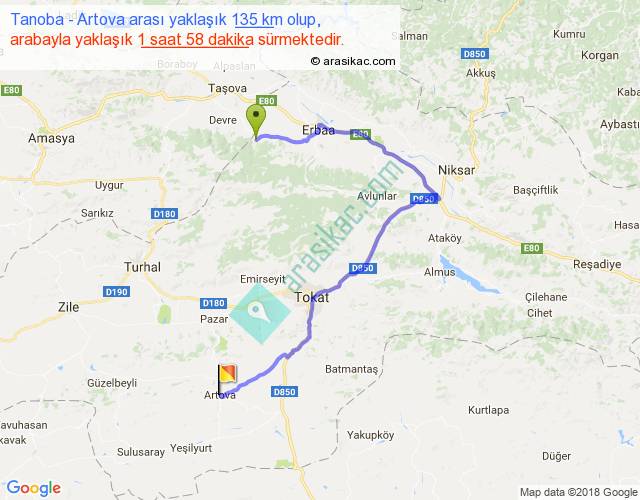 Tanoba - Artova arası yaklaşık olarak 90 km/h ile yukarıda belirtilen sürede olup, iki yerin kuş uçuşu uzaklığı (mesafesi) 60'dir. Yolculuk otobüsle 2 saat 33 dakika sürmektedir.