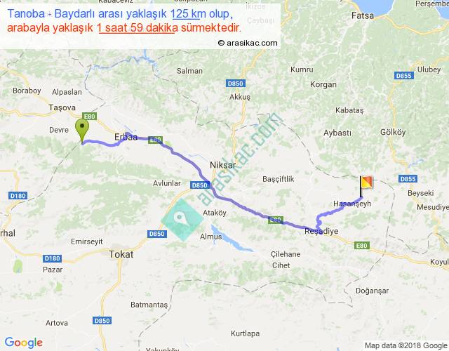 Tanoba - Baydarlı arası yaklaşık olarak 90 km/h ile yukarıda belirtilen sürede olup, iki yerin kuş uçuşu uzaklığı (mesafesi) 93'dir. Yolculuk otobüsle 2 saat 34 dakika sürmektedir.