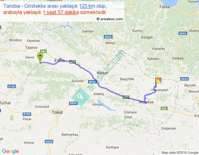 Tanoba - Cimitekke arası yaklaşık olarak 90 km/h ile yukarıda belirtilen sürede olup, iki yerin kuş uçuşu uzaklığı (mesafesi) 88'dir. Yolculuk otobüsle 2 saat 32 dakika sürmektedir.
