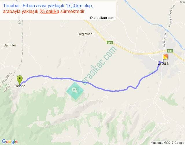 Tanoba - Erbaa arası yaklaşık olarak 90 km/h ile yukarıda belirtilen sürede olup, iki yerin kuş uçuşu uzaklığı (mesafesi) 14'dir. Yolculuk otobüsle 29 dakika sürmektedir.