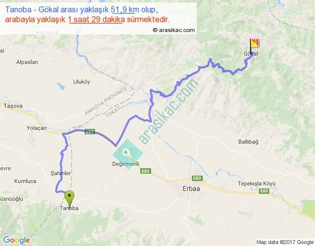 Tanoba - Gökal arası yaklaşık olarak 90 km/h ile yukarıda belirtilen sürede olup, iki yerin kuş uçuşu uzaklığı (mesafesi) 28'dir. Yolculuk otobüsle 1 saat 55 dakika sürmektedir.