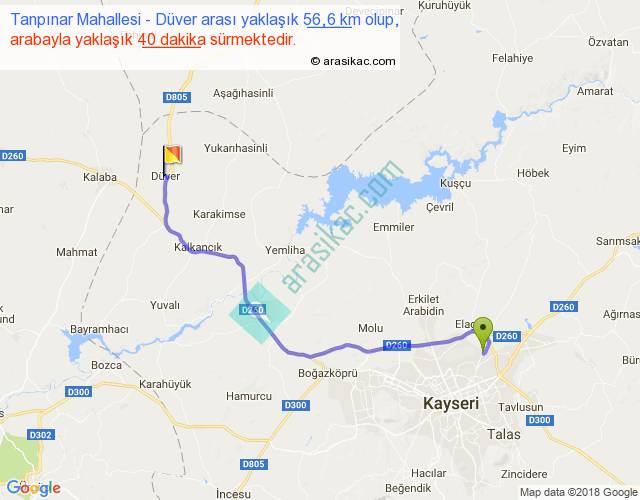 Tanpınar Mahallesi - Düver arası yaklaşık olarak 90 km/h ile yukarıda belirtilen sürede olup, iki yerin kuş uçuşu uzaklığı (mesafesi) 43'dir. Yolculuk otobüsle 52 dakika sürmektedir.