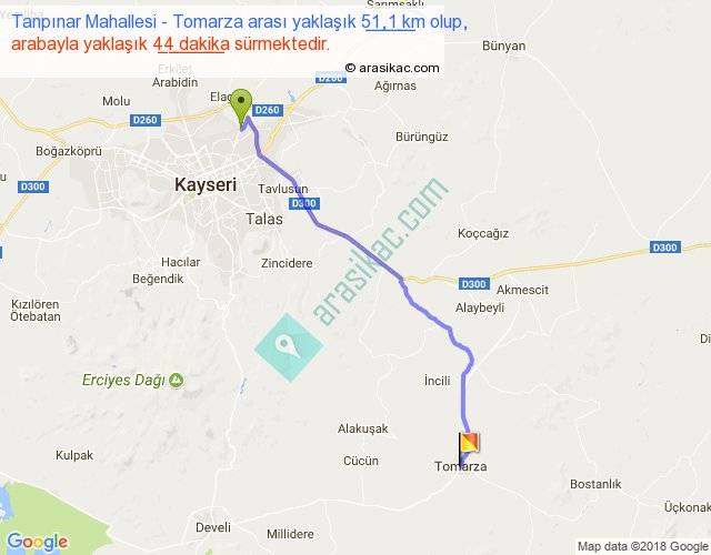 Tanpınar Mahallesi - Tomarza arası yaklaşık olarak 90 km/h ile yukarıda belirtilen sürede olup, iki yerin kuş uçuşu uzaklığı (mesafesi) 43'dir. Yolculuk otobüsle 57 dakika sürmektedir.