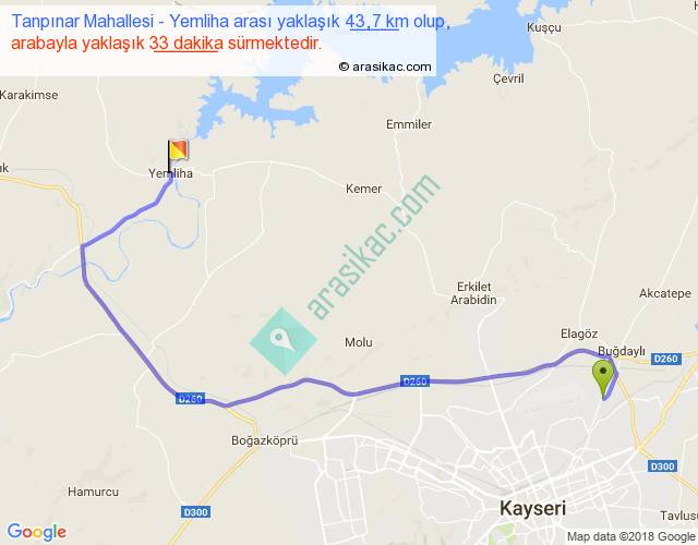 Tanpınar Mahallesi - Yemliha arası yaklaşık olarak 90 km/h ile yukarıda belirtilen sürede olup, iki yerin kuş uçuşu uzaklığı (mesafesi) 26'dir. Yolculuk otobüsle 42 dakika sürmektedir.