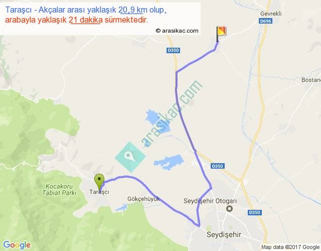 Taraşcı - Akçalar arası yaklaşık olarak 90 km/h ile yukarıda belirtilen sürede olup, iki yerin kuş uçuşu uzaklığı (mesafesi) 11'dir. Yolculuk otobüsle 27 dakika sürmektedir.
