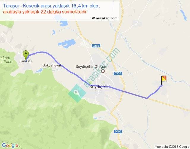 Taraşcı - Kesecik arası yaklaşık olarak 90 km/h ile yukarıda belirtilen sürede olup, iki yerin kuş uçuşu uzaklığı (mesafesi) 14'dir. Yolculuk otobüsle 28 dakika sürmektedir.