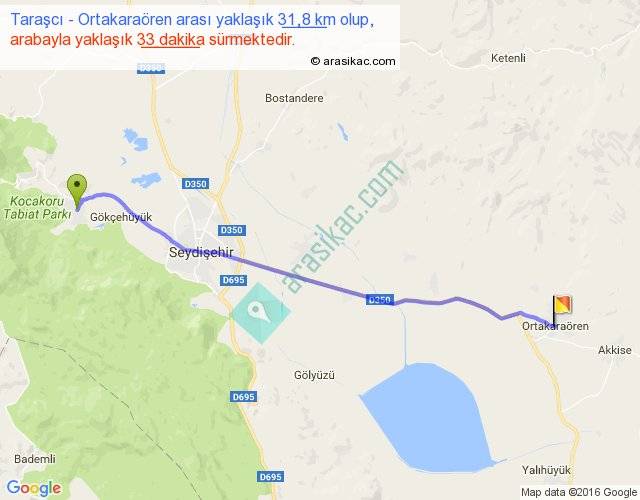 Taraşcı - Ortakaraören arası yaklaşık olarak 90 km/h ile yukarıda belirtilen sürede olup, iki yerin kuş uçuşu uzaklığı (mesafesi) 30'dir. Yolculuk otobüsle 42 dakika sürmektedir.