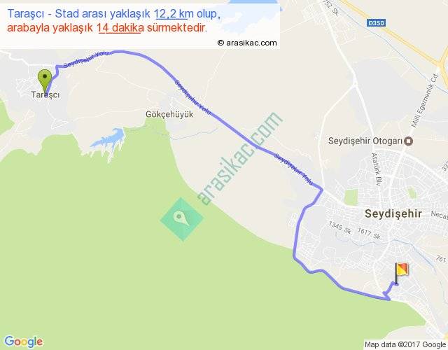Taraşcı - Stad arası yaklaşık olarak 90 km/h ile yukarıda belirtilen sürede olup, iki yerin kuş uçuşu uzaklığı (mesafesi) 9'dir. Yolculuk otobüsle 18 dakika sürmektedir.