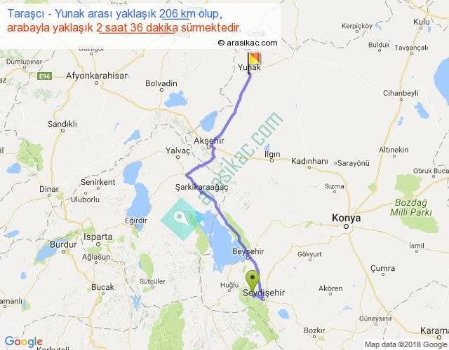 Taraşcı - Yunak arası yaklaşık olarak 90 km/h ile yukarıda belirtilen sürede olup, iki yerin kuş uçuşu uzaklığı (mesafesi) 152'dir. Yolculuk otobüsle 3 saat 22 dakika sürmektedir.