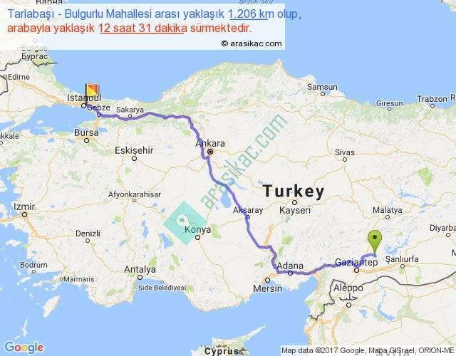 Tarlabaşı - Bulgurlu Mahallesi arası yaklaşık olarak 90 km/h ile yukarıda belirtilen sürede olup, iki yerin kuş uçuşu uzaklığı (mesafesi) 857'dir. Eğer belirtilen yerler arasında uçak seferi var ise bu süre uçakla 1 saat 19 dakika'ya kadar düşebilir. Yolculuk otobüsle 16 saat 16 dakika sürmektedir.