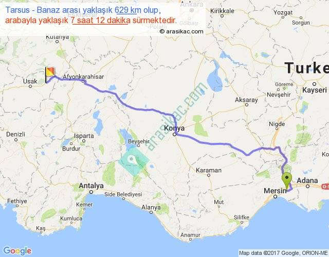 Tarsus - Banaz arası yaklaşık olarak 90 km/h ile yukarıda belirtilen sürede olup, iki yerin kuş uçuşu uzaklığı (mesafesi) 492'dir. Eğer belirtilen yerler arasında uçak seferi var ise bu süre uçakla 45 dakika'ya kadar düşebilir. Yolculuk otobüsle 9 saat 21 dakika sürmektedir.